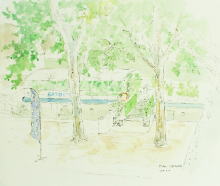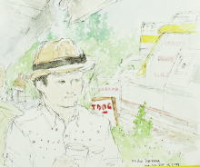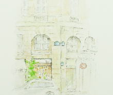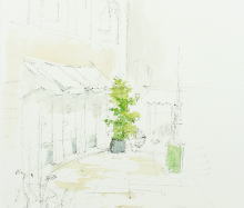 鉢植えのむこうには ヴァンソン・レサール氏が 店の外の路上に